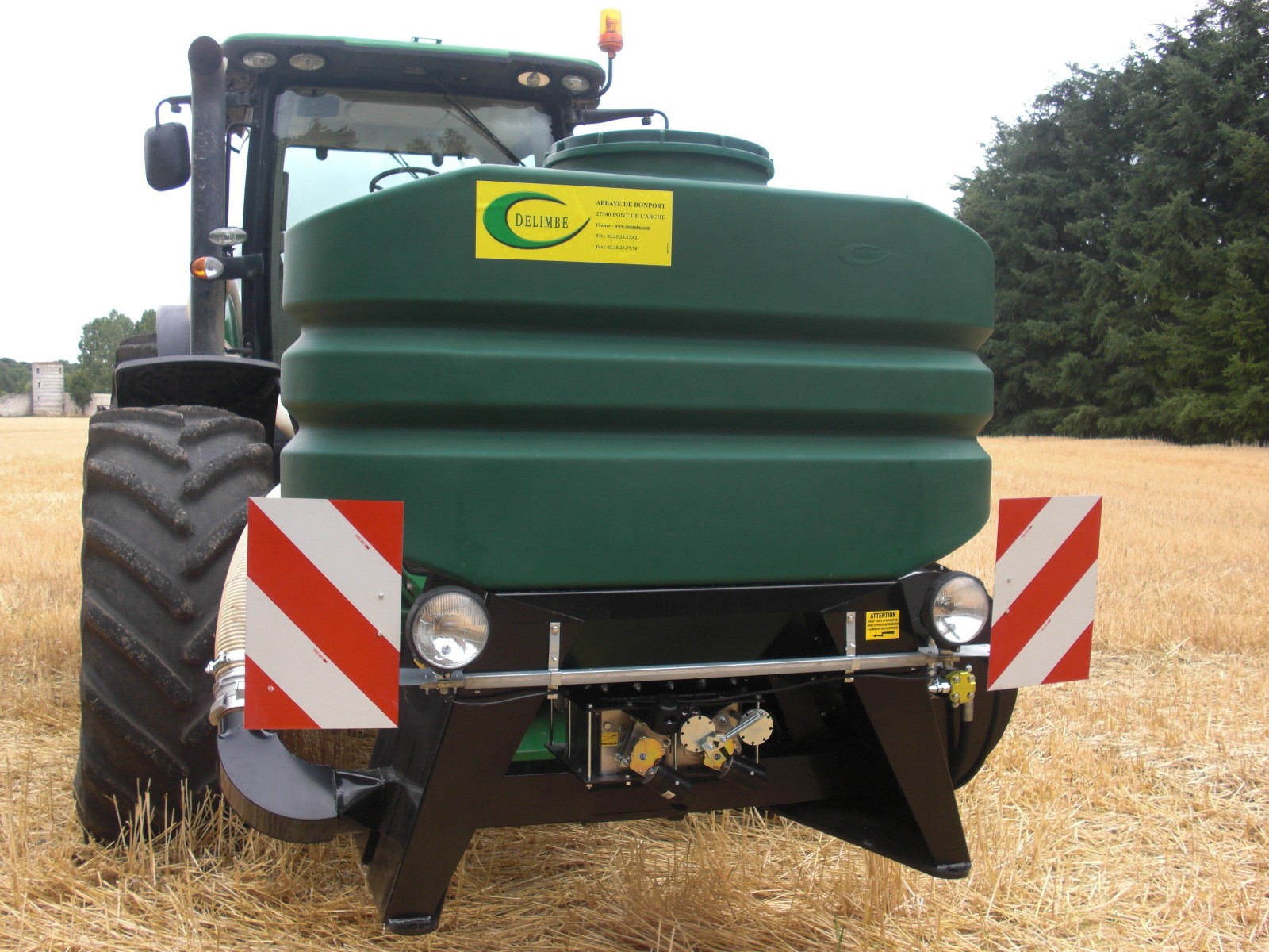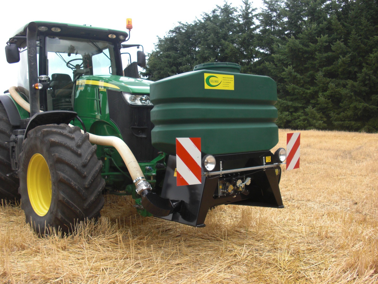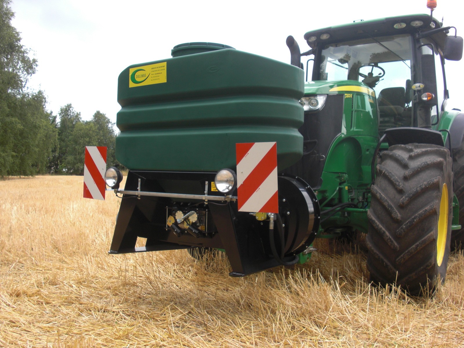 - It is mounted on the front of the tractor, with the distribution head at the rear.