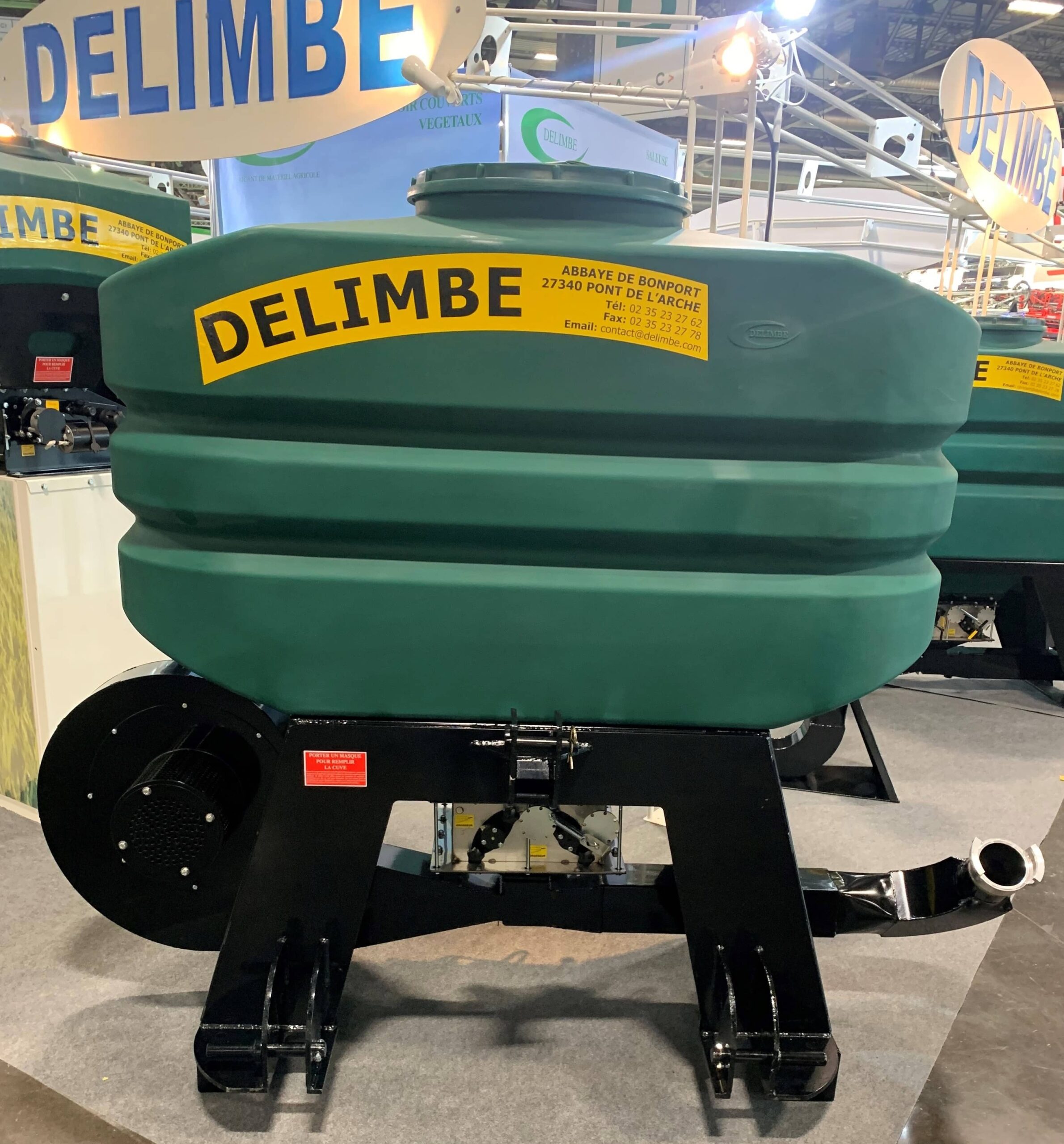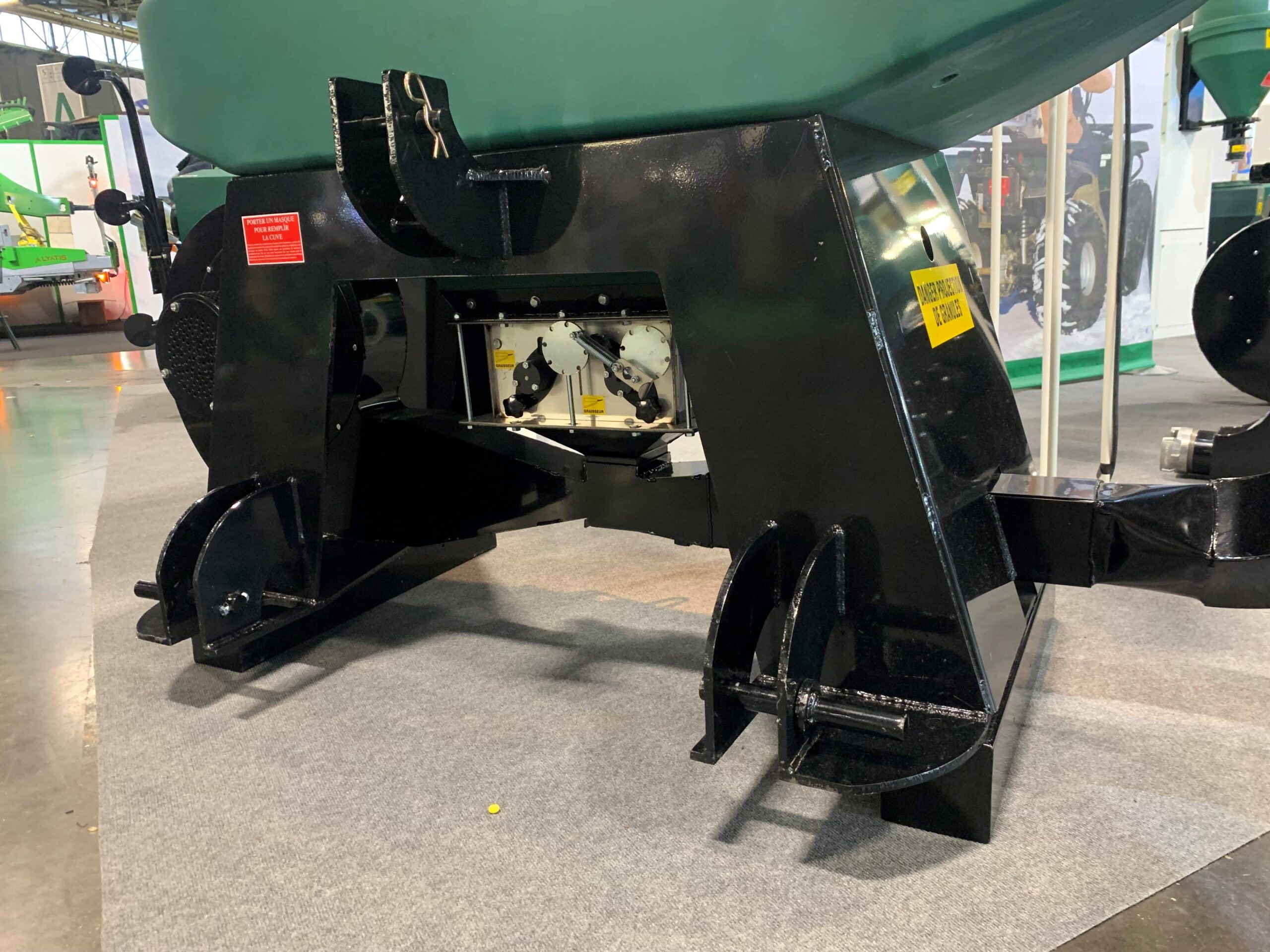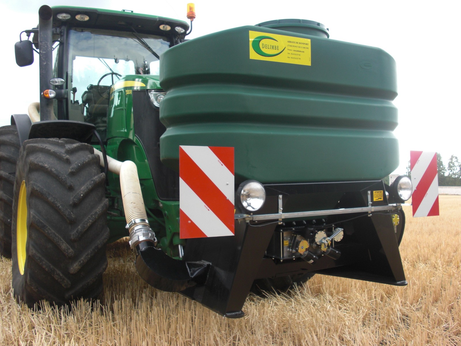 - It is mounted on the front of the tractor, with the distribution head at the rear.
