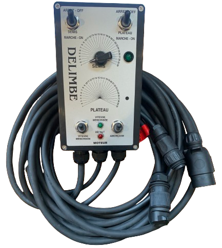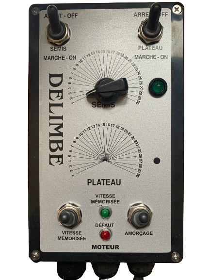 - Le système DPA ISO est équipé d’un témoin lumineux de contrôle et d’un boitier de commande en cabine qui reprend les fonctions des semoirs DELIMBE. Il est muni d’interrupteurs de mémorisation de vitesse et amorçage de semis en bout de rang.