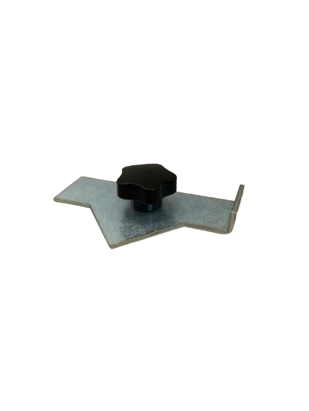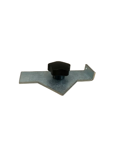 Pièce en acier, curseur en forme de flèche et bouton moleté plastique vis avec rondelle inox pour réglage de débit inclus.